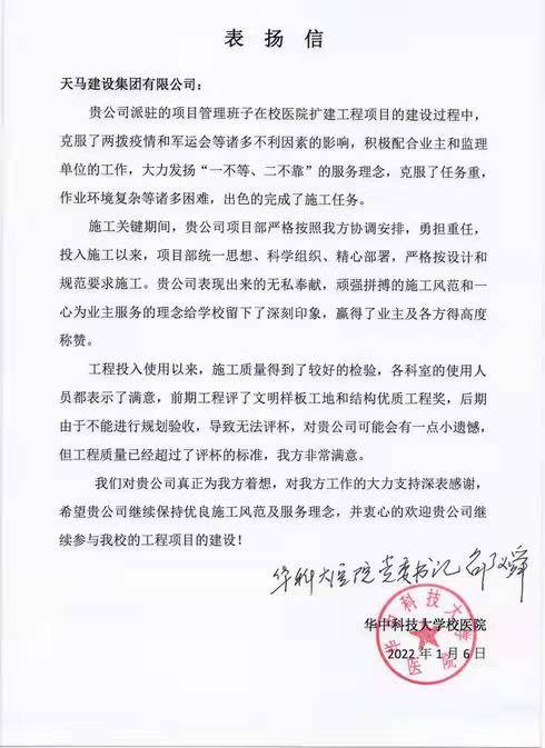 凡是過往,皆為序章。感謝華中科技大學(xué)校醫(yī)院方對(duì)天馬建設(shè)集團(tuán)有限公司的支持和認(rèn)可,一封表?yè)P(yáng)信是認(rèn)可更是繼續(xù)前行的動(dòng)力。在今后工作中,公司將繼續(xù)秉承“逢建必優(yōu)”的宗旨,發(fā)揚(yáng)嚴(yán)謹(jǐn)務(wù)實(shí)的工作作風(fēng),加強(qiáng)細(xì)節(jié)管控,全力推進(jìn)工程項(xiàng)目,低風(fēng)險(xiǎn)、高標(biāo)準(zhǔn)、高質(zhì)量、高服務(wù)的意識(shí),積極完成業(yè)主及公司的各項(xiàng)工作指標(biāo)。