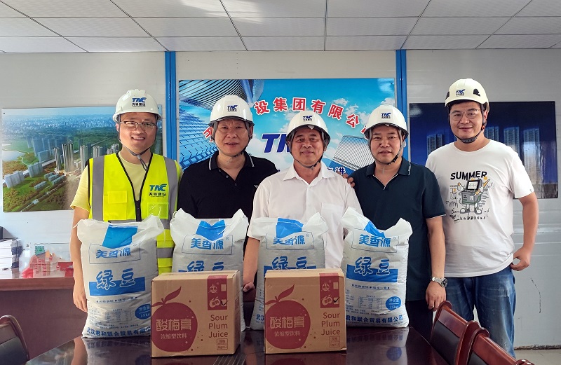 酷暑盛夏、熱浪滾滾,在我司在建工地上,一線施工人員頭頂烈日、揮汗如雨,正緊張有序的推進項目建設。為關(guān)心關(guān)愛一線建筑工人的身體健康,切實做好高溫天氣建筑工地防暑降溫工作,集團組織開展夏季“送清涼”慰問活動。由集團工會主席余勝利帶隊,總工劉剛、副總馮小龍、綜合辦主任胡海華一行深入基層,為一線工人送去了綠豆、酸梅湯等防暑降溫物資,送去絲絲涼意與關(guān)懷。